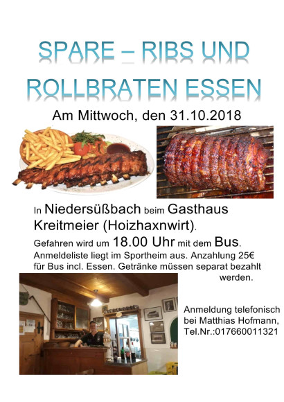 Spare-Ribs- und Rollbraten-Essen in Niedersüßbach im Gasthaus Kreitmeier (Hoizhaxnwirt) am Mittwoch 31.10.2018 – Abfahrt mit dem Bus um 18:00 Uhr. Anmeldung war bei Matthias Hofmann telefonisch möglich.