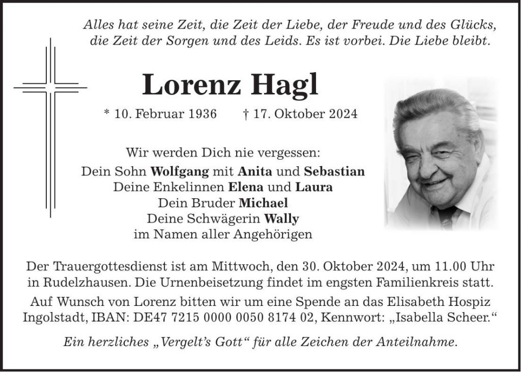 Der TSV Rudelzhausen trauert um sein langjähriges Mitglied Hagl Lorenz, der am 17. Oktober 2024 verstorben ist.
