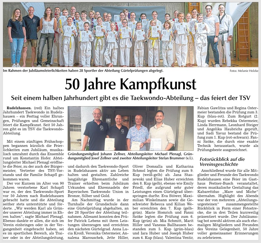 Dieser Anlass wurde am Samstag 19.Juli 2025 mit einem Festtag gebührend gefeiert. Mit einem zünftigen Frühshoppen wurde das Jubiläum begonnen, musikalisch umrahmt durch das Ensemble rund um Konstantin Hofer. Abteilungsleiter Michael Plenagl begrüßte unter den anwesenden Gästen neben dem Bürgermeister und dem TSV-Vorstand ganz besonders Familie Schapfl. Der vor Kurzem im Alter von 90 Jahren verstorbene Karl Schapfl war es, der den Taekwondo-Sport vor 50 Jahren nach Rudelzhausen brachte und die Abteilung seither stets unterstützte und förderte. „Wir werden Karl als Gründer unserer Abteilung immer in Ehren halten“, so Michael Plenagl in seiner Ansprache.