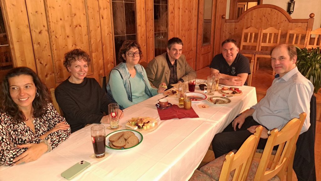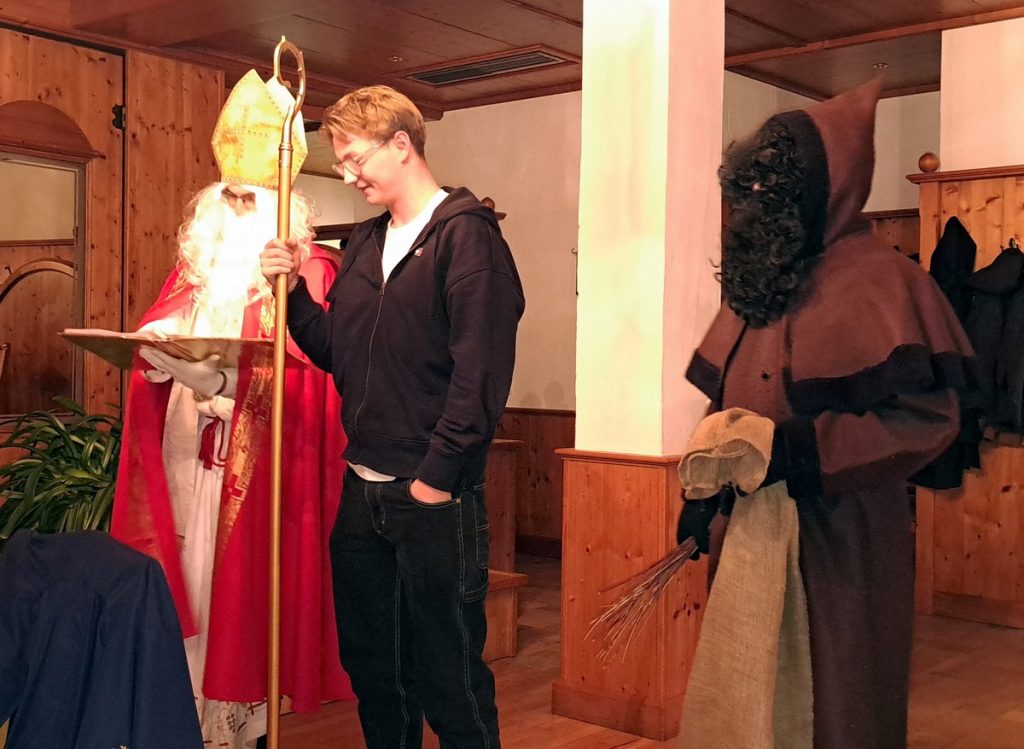 Jetzt ging die Tür auf und völlig überraschend stattete uns der Nikolaus mit Krampus einen kurzen Besuch ab. In seinem goldenen Buch stand einiges über die Fußballspieler. Der Krampus drehte eine Runde und lies einigen seine Rute spüren. Dann verabschiedeten sich beide wieder.
