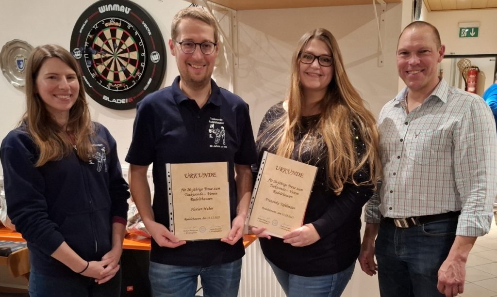Rudelzhausen. (red) Die Taekwondo-Abteilung des TSV hat langjährige Mitglieder geehrt. Inge Todtenbier wurde für zehn Jahre, Marina Falter, Selina Gleichauf und Alexandra Adam wurden für 15 Jahre, Maximilian Aurin, Sven Jelken, Franziska Tafelmaier und Florian Huber für 20 Jahre und Stefan Brummer und Christian Kronthaler für 25 Jahre Mitgliedschaft ausgezeichnet. Peter Elfinger wurde für 35-jährige Mitgliedschaft geehrt. Das Bild zeigt die Mitglieder Florian Huber (2.v.l.) und Franziska Tafelmaier (2.v.r.) mit Kassiererin Julia Rosic (l.) und Abteilungsleiter Michael Plenagl (r.). Foto: TSV
