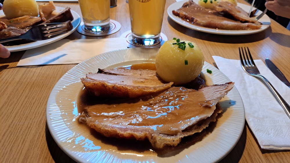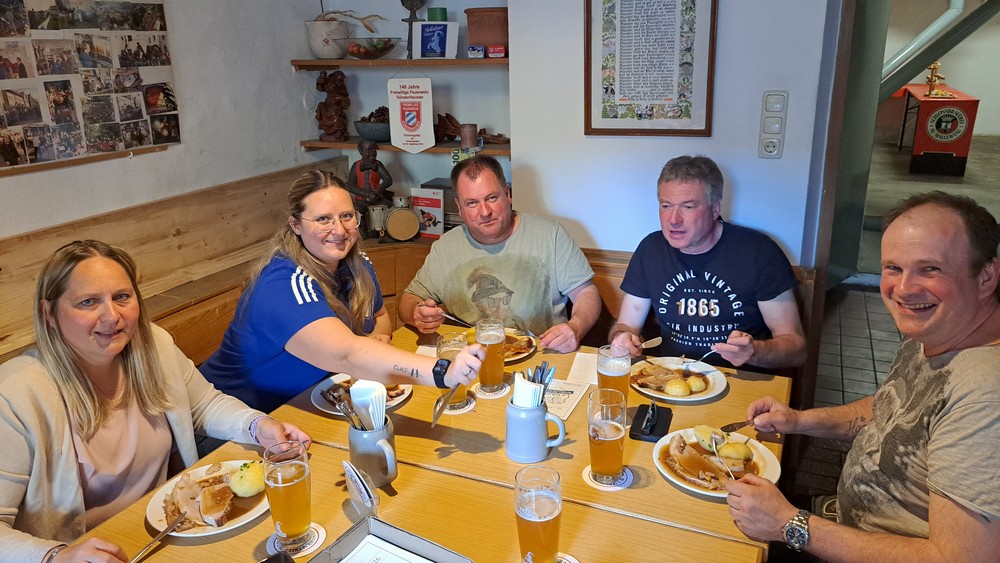 Dann war es natürlich Zeit zur ausgiebigen Bierprobe. Dazu gab’s vom Team des Schloßbräukellers Obazdn mit frischen Brezen als Vorspeise und dann leckeren Schweinebraten mit Kartoffelknödel. Zu späterer Stunde dann auch noch Leberkäse.