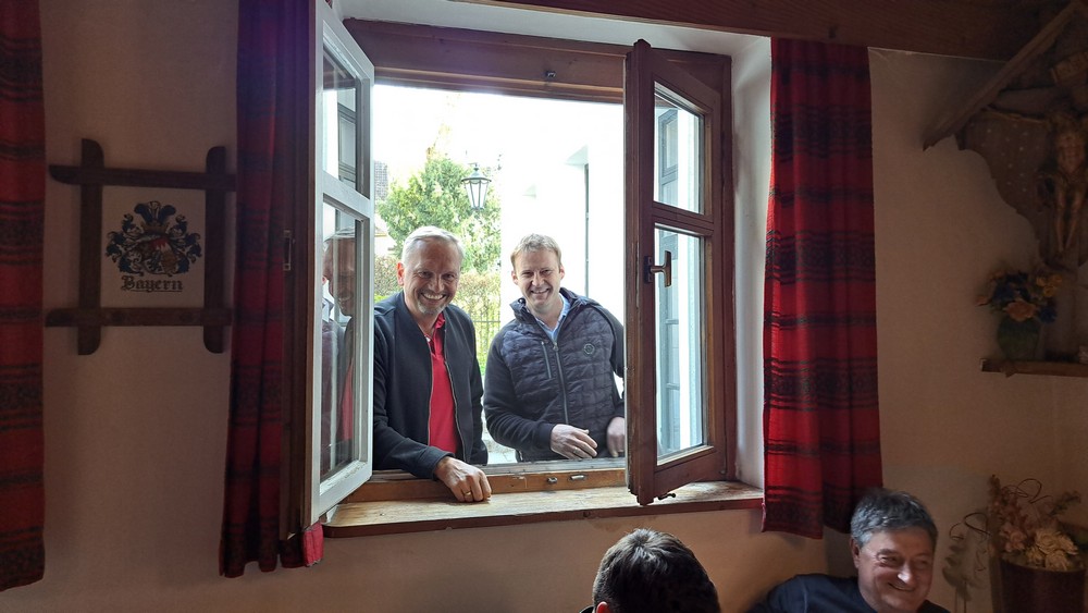 Braumeister Stefan Ebensperger und 1.Vorsitzender des TSV bei der Begrüßung – Zwei Biertester fanden den „geheimen“ Eingang ins Bräustüberl nicht rechtzeitig